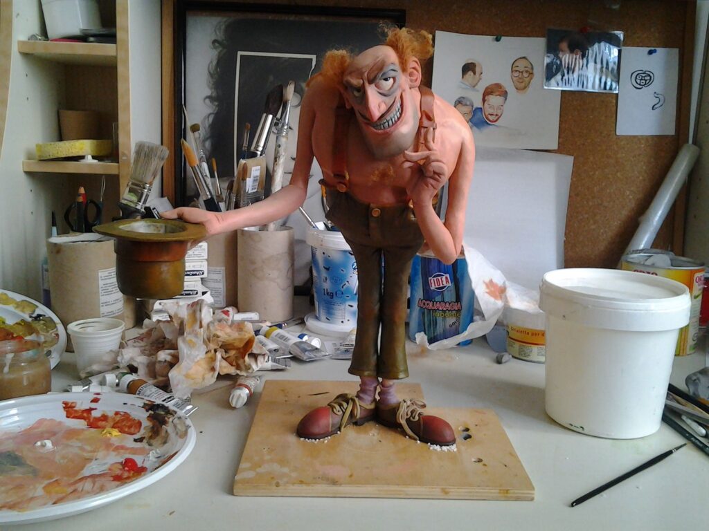La fase conclusiva è la decorazione pittorica, realizzata interamente a pennello con colori acrilici. Il colore non ha una funzione puramente estetica, ma serve a rafforzare i volumi, le espressioni e il carattere del personaggio, completando il passaggio dalla struttura alla presenza definitiva dell’opera.