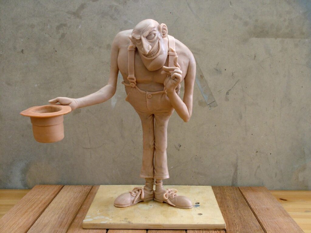 Su questa struttura viene applicata la pasta polimerica, modellata progressivamente per costruire il corpo, i gesti e i dettagli. La materia segue il disegno iniziale, ma viene continuamente messa in discussione dal lavoro manuale: ogni pressione, ogni aggiunta o sottrazione modifica leggermente l’intenzione, arricchendola. È in questa fase che l’opera trova la sua identità definitiva, tra controllo e imprevisto.